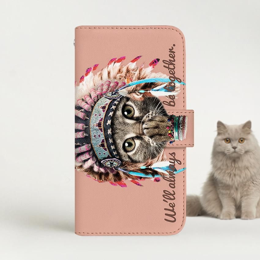with NYAGO 手帳型 / 厚手 au その他 インディアン ソラちゃん 肉球をペロペロするにゃー。 かわいい猫フェイス手帳 バーミリオン オレンジ 7021