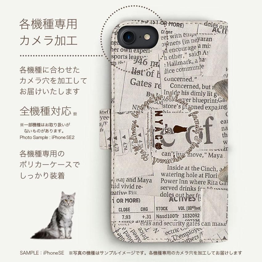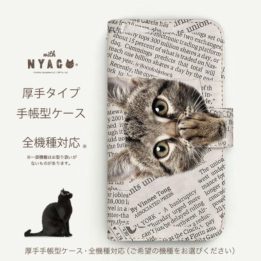 with NYAGO 手帳型 / 厚手 au その他 ソラちゃん 肉球をペロペロするにゃー。 英字新聞 デザイン かわいい猫フェイス手帳 ホワイト 7110