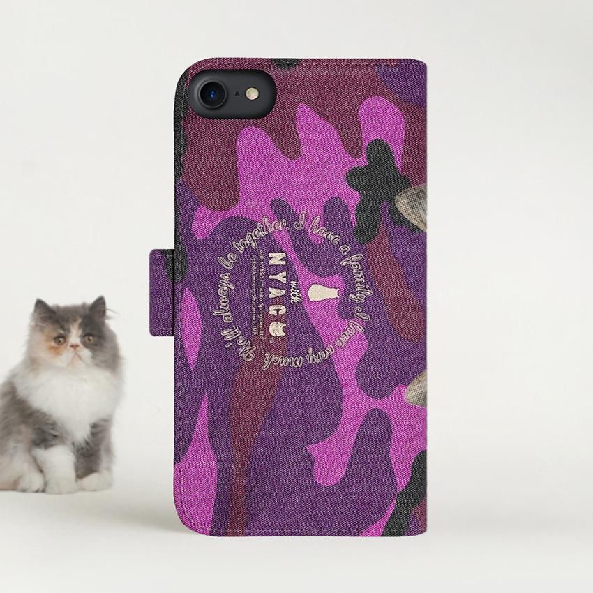 with NYAGO 手帳型 / 厚手 SoftBank ソラちゃん 肉球をペロペロするにゃー。 アーミー 迷彩柄 カモ柄 かわいい猫フェイス手帳 パープル 7125