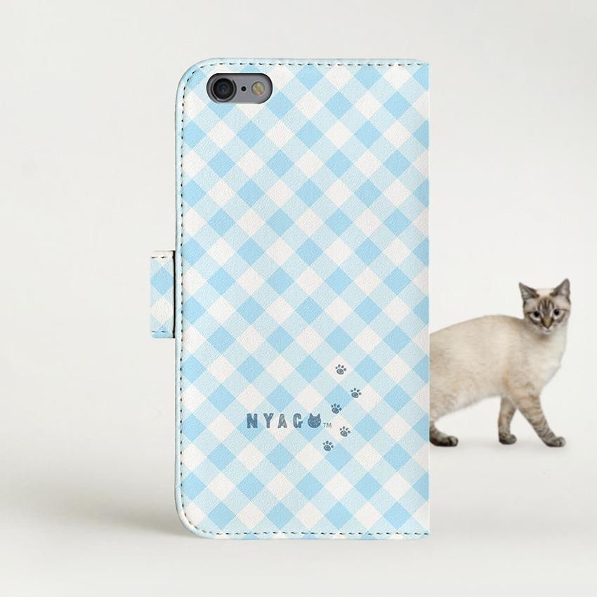 with NYAGO 手帳型 / 厚手 Y!mobile NYAGO サマー フラワー ダイアリー キャット シルエット ブルー チェッククロス柄 てくてくお散歩 2675