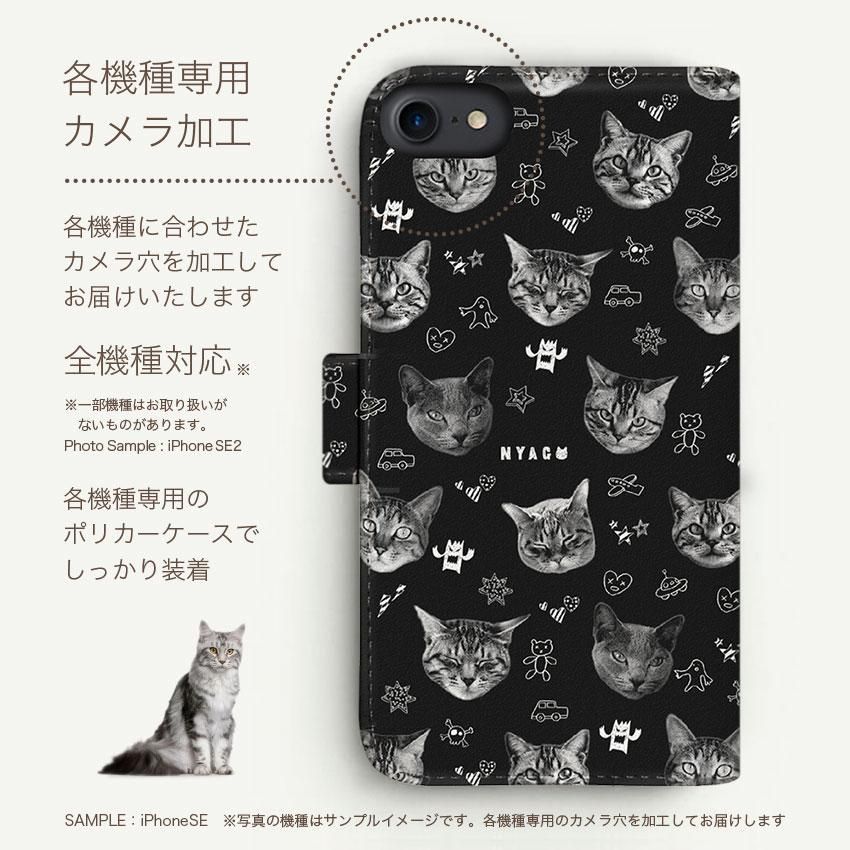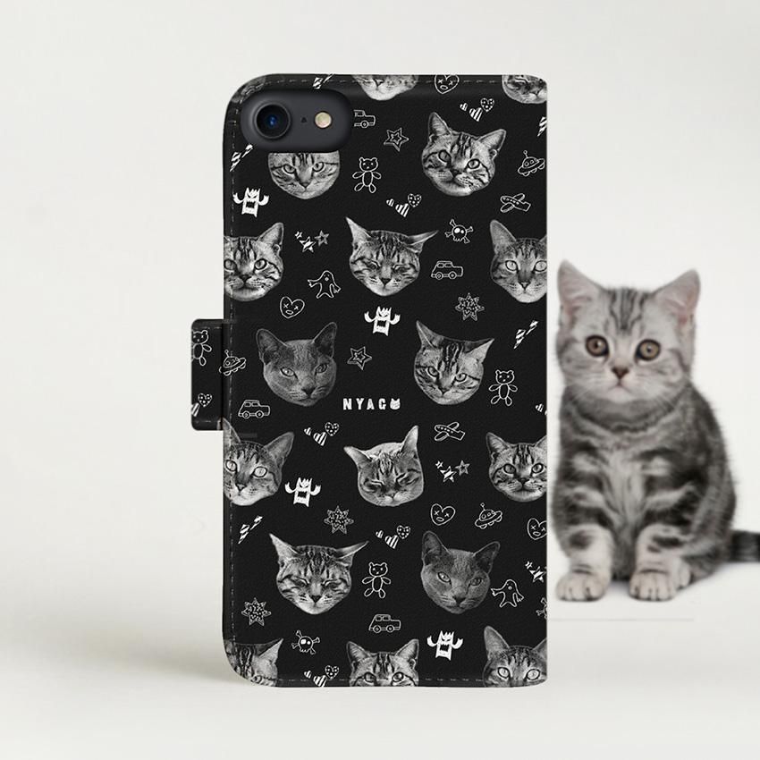 with NYAGO 手帳型 / 厚手 楽天モバイル/UQ mobile NYAGO ノート キュート フェイス モノクロ キャット 2605