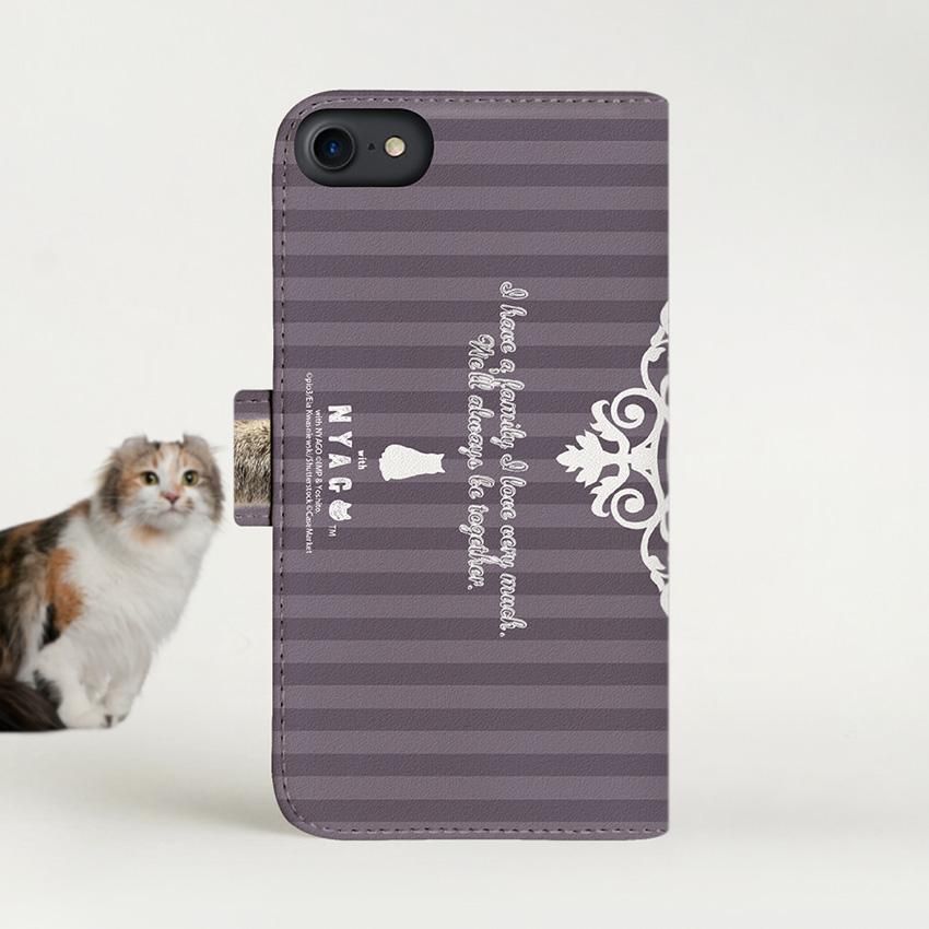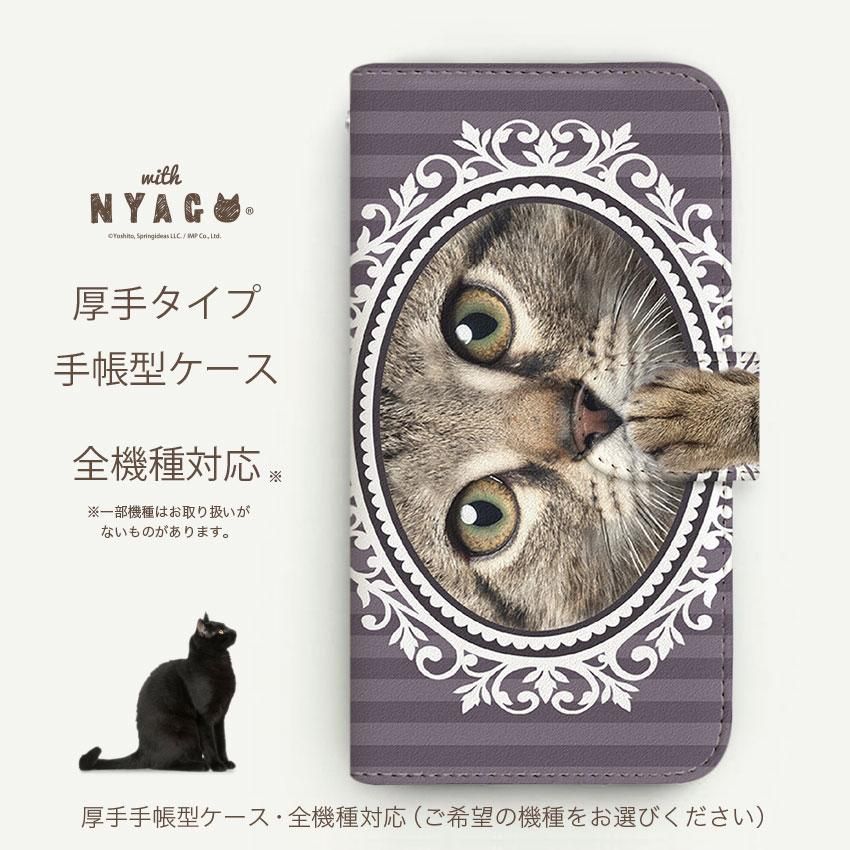 with NYAGO 手帳型 / 厚手 楽天モバイル/UQ mobile NYAGO ボタニカルリース 肉球 ペロペロだにゃ〜。 キジトラ 2659