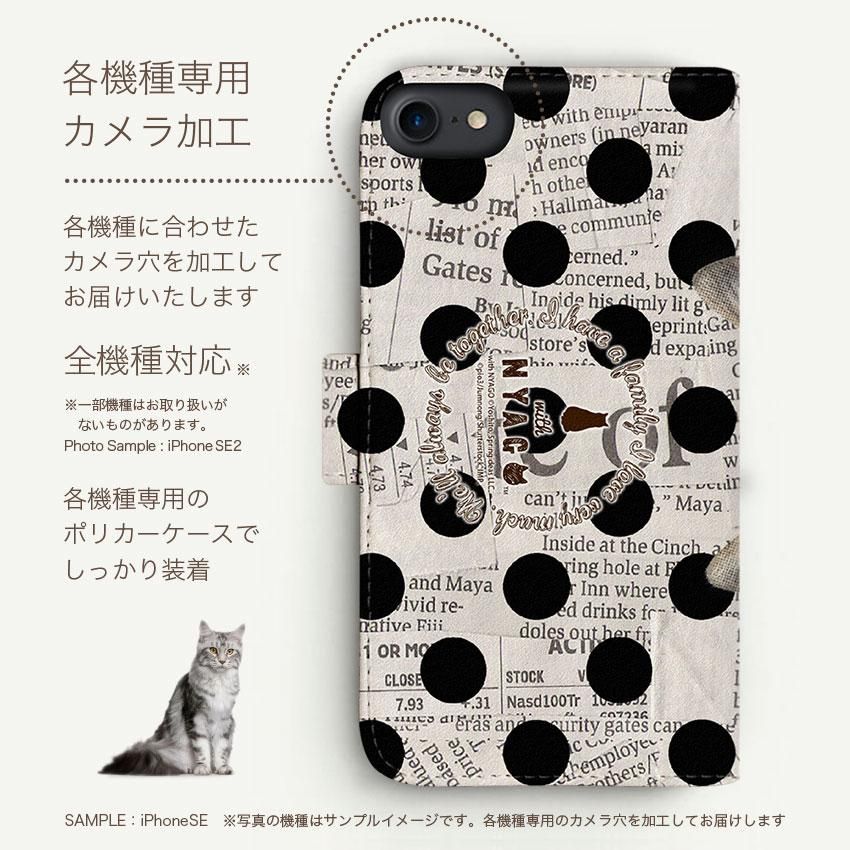 with NYAGO 手帳型 / 厚手 楽天モバイル/UQ mobile ソラちゃん 肉球をペロペロするにゃー。 ドット 英字新聞 かわいい猫フェイス手帳 ブラック ドット 7114