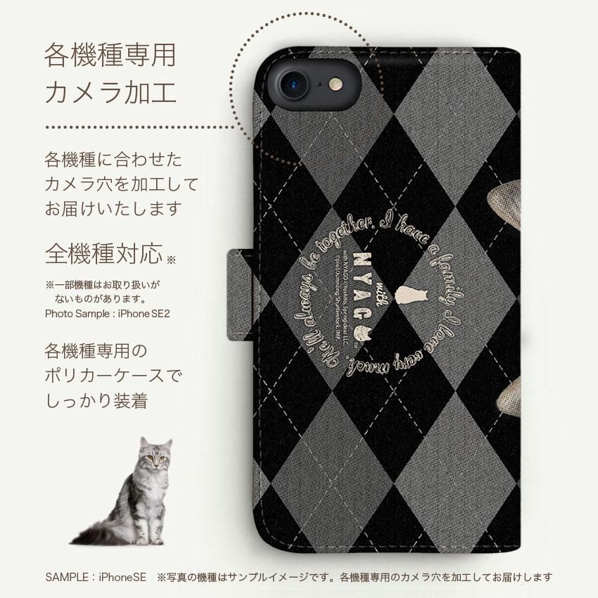 with NYAGO 手帳型 / 厚手 楽天モバイル/UQ mobile ソラちゃん 肉球をペロペロするにゃー。 アーガイル柄 かわいい猫フェイス手帳 7127