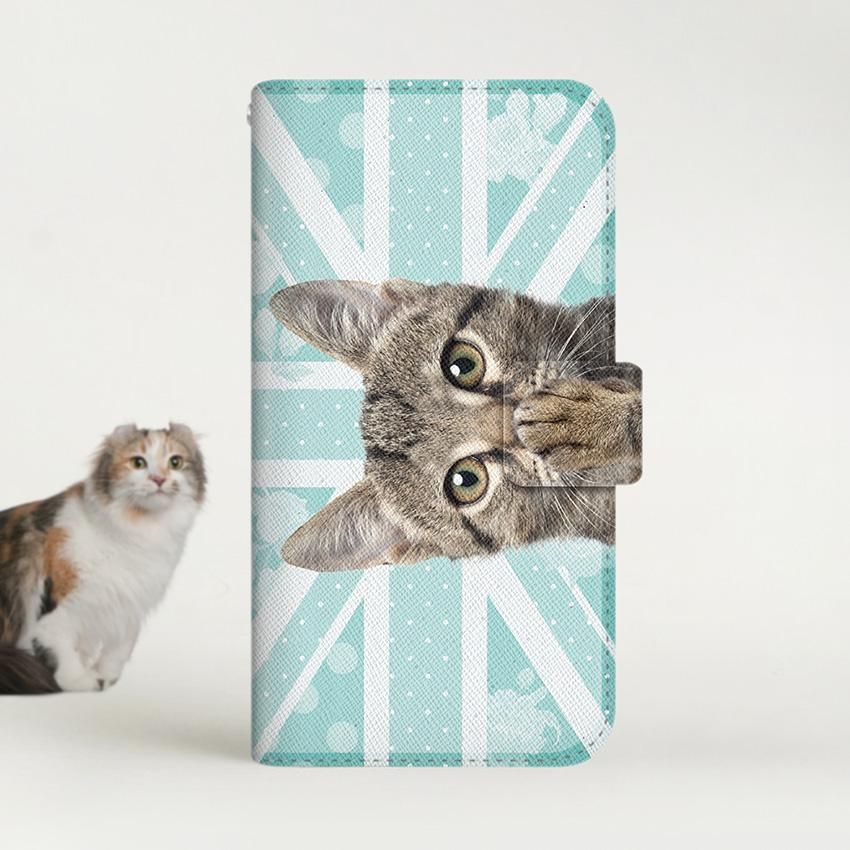 with NYAGO 手帳型 / 薄型 au Xperia NYAGO ノート キュート 肉球をペロペロするにゃ〜。 - にゃんとも ユニオンジャック だにゃ〜。 グリーン 2435