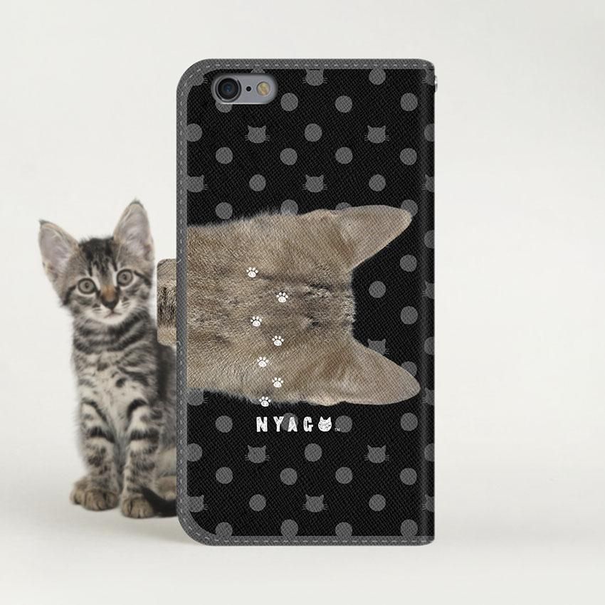 with NYAGO 手帳型 / 薄型 楽天モバイル/UQ mobile NYAGO ノート キュート 肉球をペロペロするにゃ〜。 ドット ブラック 2249