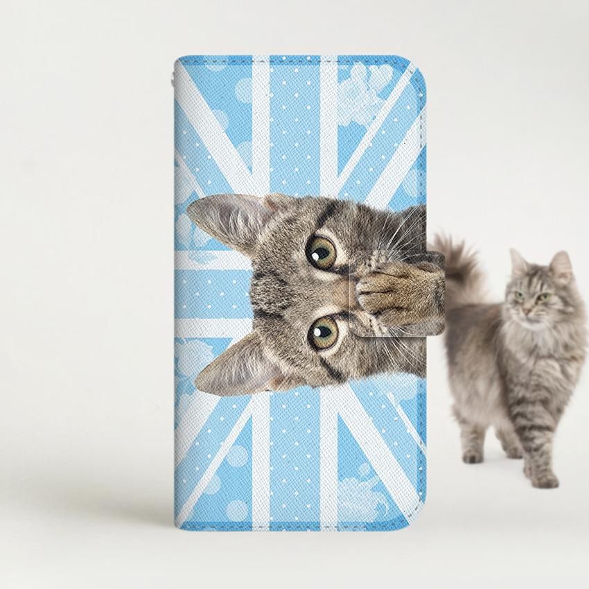 with NYAGO 手帳型 / 薄型 楽天モバイル/UQ mobile NYAGO ノート キュート 肉球をペロペロするにゃ〜。 - にゃんとも ユニオンジャック だにゃ〜。 ブルー 2434
