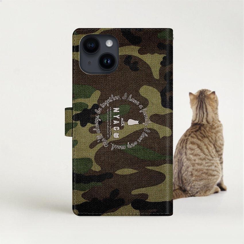 with NYAGO 手帳型 / 厚手 iPhone パイロット ソラちゃん 肉球をペロペロするにゃー。 アーミー 迷彩柄 カモ柄 かわいい 猫 フェイス グリーン 7178