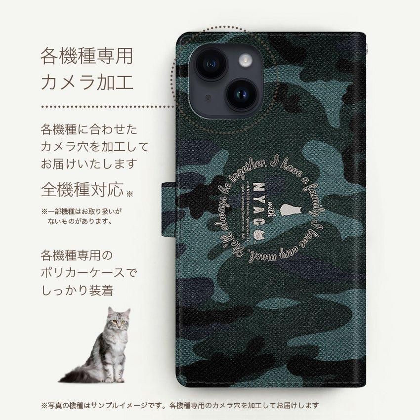 with NYAGO 手帳型 / 厚手 iPhone パイロット ソラちゃん 肉球をペロペロするにゃー。 アーミー 迷彩柄 カモ柄 かわいい 猫 フェイス ブルー 7179