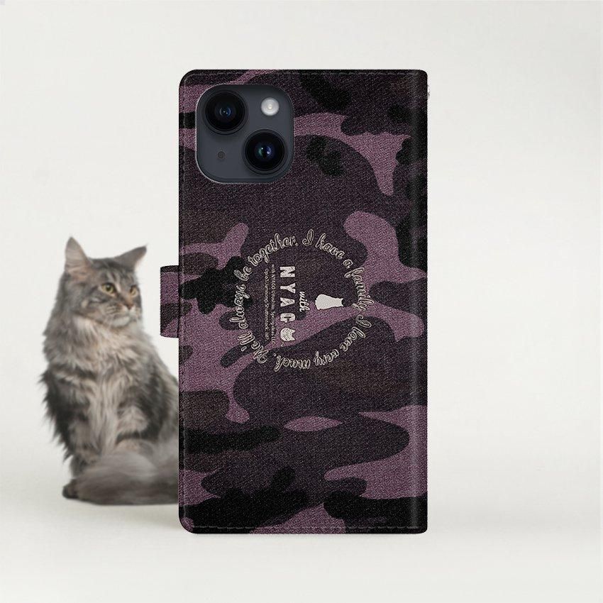 with NYAGO 手帳型 / 厚手 docomo AQUOS インディアン ソラちゃん 肉球をペロペロするにゃー。 アーミー 迷彩柄 カモ柄 かわいい 猫 フェイス パープル 7174
