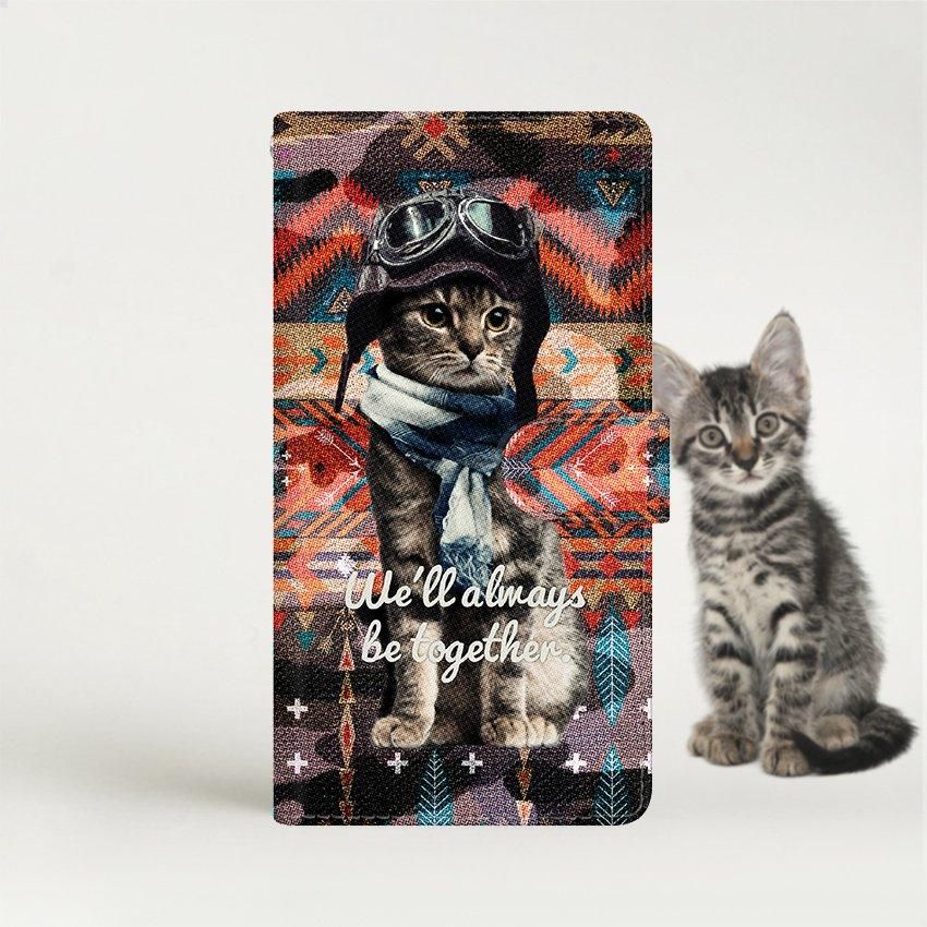 with NYAGO 手帳型 / 厚手 au Galaxy パイロット ソラちゃん 肉球をペロペロするにゃー。 かわいい猫フェイス手帳 セコイア カラー 7176