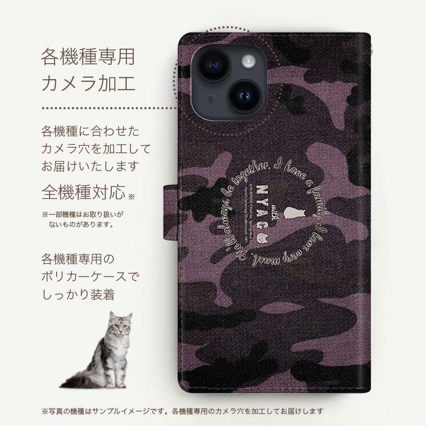 with NYAGO 手帳型 / 厚手 SoftBank パイロット ソラちゃん 肉球をペロペロするにゃー。 アーミー 迷彩柄 カモ柄 かわいい 猫 フェイス パープル 7180