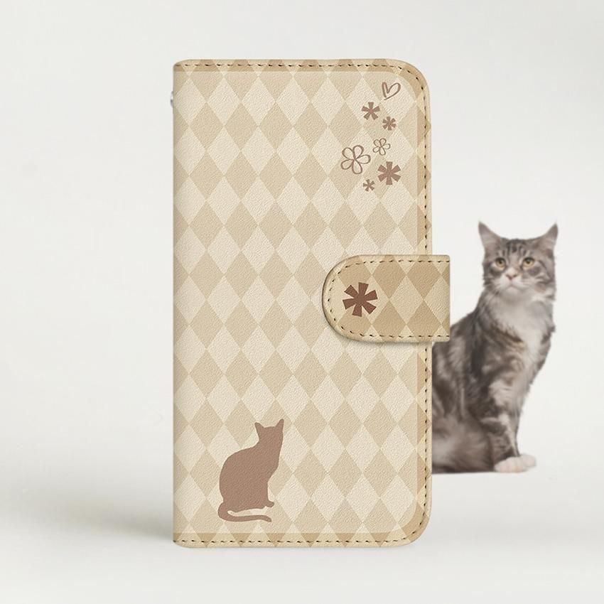 with NYAGO 手帳型 / 厚手 Google Pixel NYAGO フレンチ フラワー キャット シルエット ダイヤ柄 & おすましだにゃん。 クリーム 2458