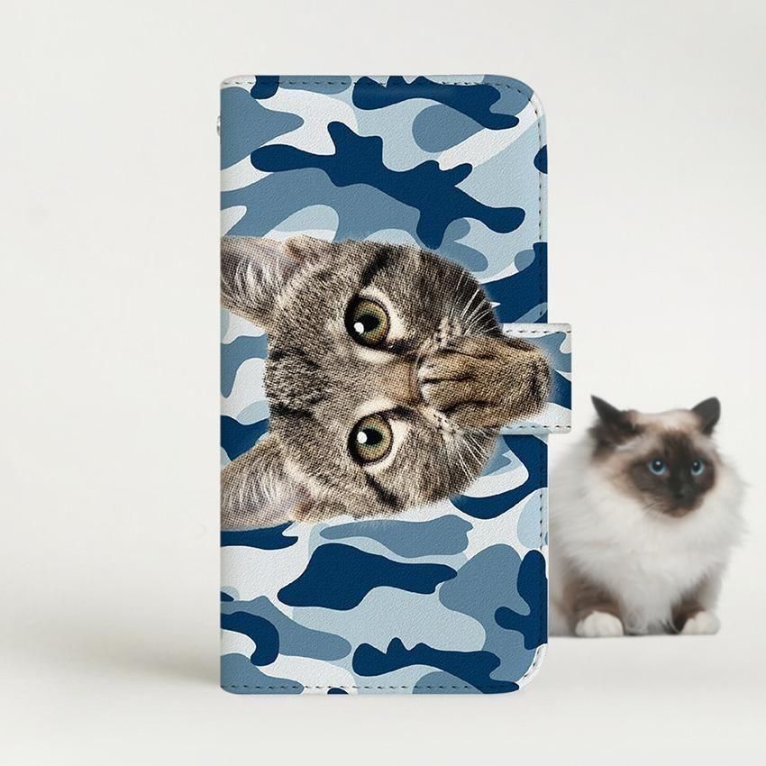 with NYAGO 手帳型 / 厚手 Google Pixel ソラちゃん 肉球をペロペロするにゃー。 迷彩柄 カモ柄 かわいい猫フェイス手帳 ブルー 7121