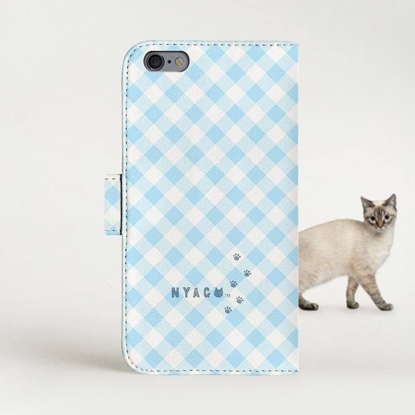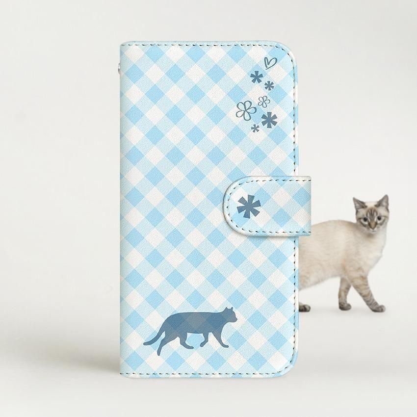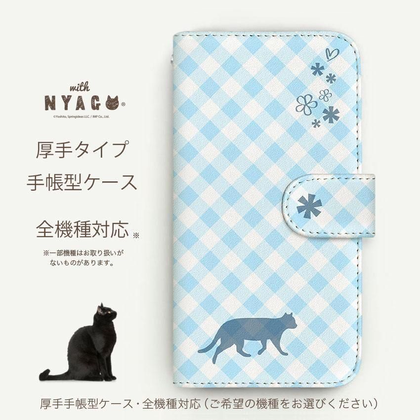 with NYAGO 手帳型 / 厚手 Google Pixel NYAGO サマー フラワー ダイアリー キャット シルエット ブルー チェッククロス柄 てくてくお散歩 2675